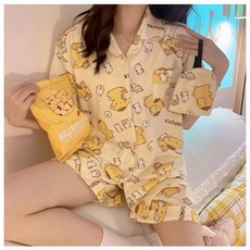 ANYOU 여성 라운드넥 여름 반팔반바지 잠옷 루즈핏 예쁜 귀엽고 카툰 홈웨어