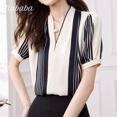 나바바 NB1527 여성 빈티지 스트라이프 브이넥 반팔 블라우스