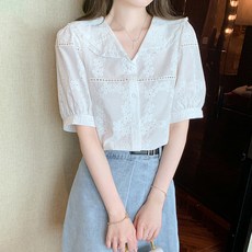 행복여[신상무배]더블 레이스 카라 퍼프 소매 블라우스