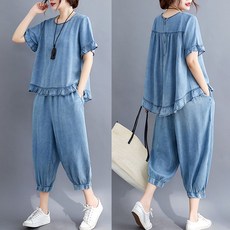 중년 여성 빅사이즈 여름 라운드넥 배색 데님 반팔 + 밴딩 7부 데님 팬츠 세트