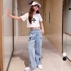 오렌지다몸 여아용 십자가 크롭티 데님 팬츠 세트